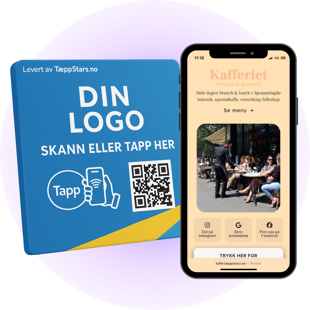 En kunde har nettopp hatt en fantastisk opplevelse hos deg. På vei ut "tæpper" de telefonen sin på et elegant skilt på disken. Vips! Før de forlater, har du en ny 5-stjerners anmeldelse, en ny følger på Instagram, og de har allerede booket sin neste time. Alt fra én enkel tæpp. Ingen app. Ikke noe mas.